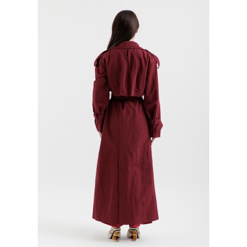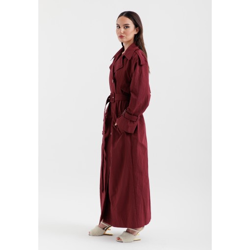 • burgundy maxi trench coat made with light material.