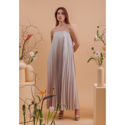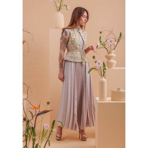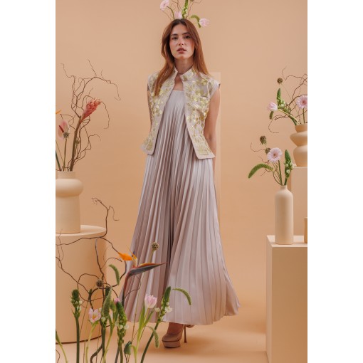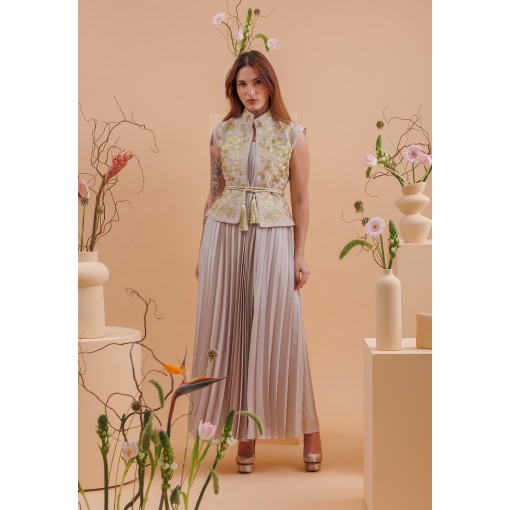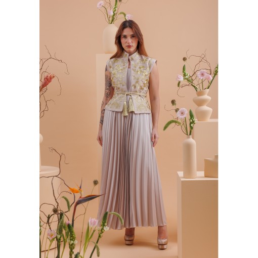 • فستان من قماش مطوّى الطيات (pleated) بلون طوبي (رمادي مائل للبني)، مع صديري مطرّز بالكامل بغرز ذهبية وحزام مطابق.