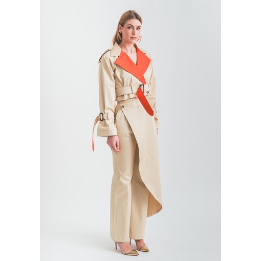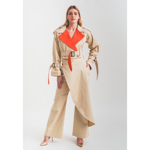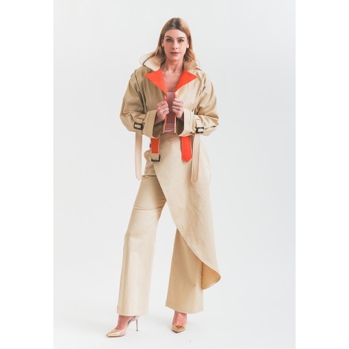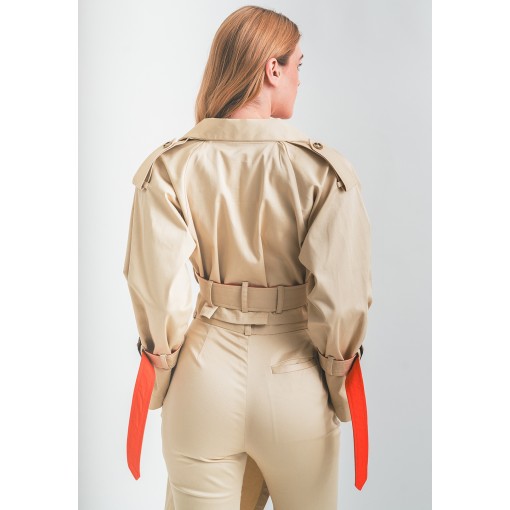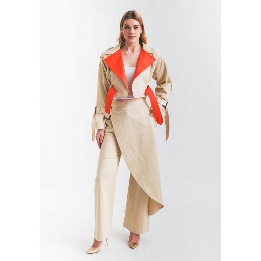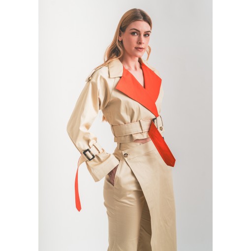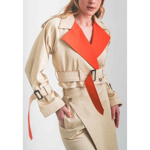 • Cropped Trench Coat in Beige with Orange Color Collar