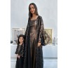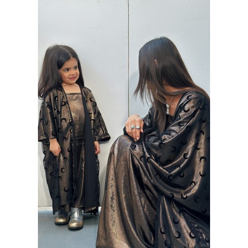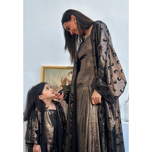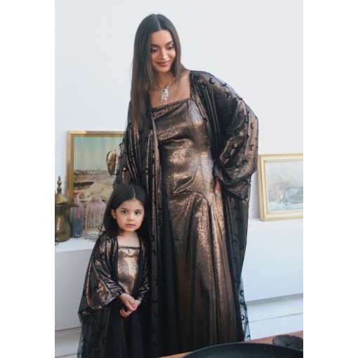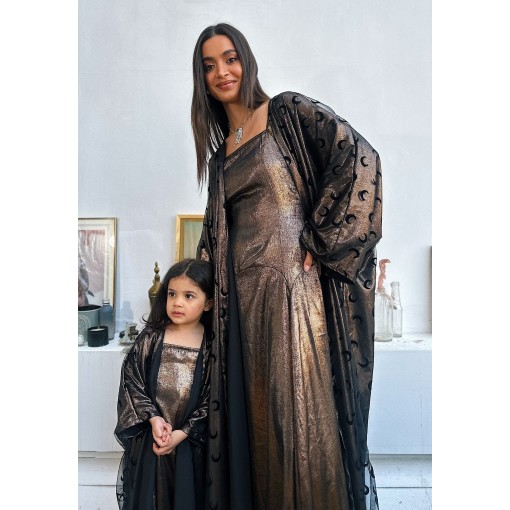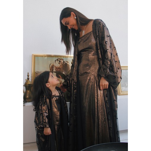 • "The “Hilal” two-piece Ramadan outfit beautifully embodies the spirit of Ramadan and Eid with its thoughtful design and luxurious materials. The inner dress is crafted from a stunning brown silky fabric with a shimmering finish, evoking elegance and sophistication, perfect for evening Ramadan gatherings.The outer bisht is a flowy overlay adorned with intricate crescent patterns, a symbolic nod to the crescent moon that signifies Ramadan. The combination of the shimmering dress and the celestial inspired bisht is ideal for celebrating meaningful moments during the holy month.Additional info:
