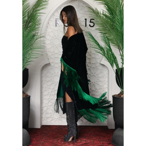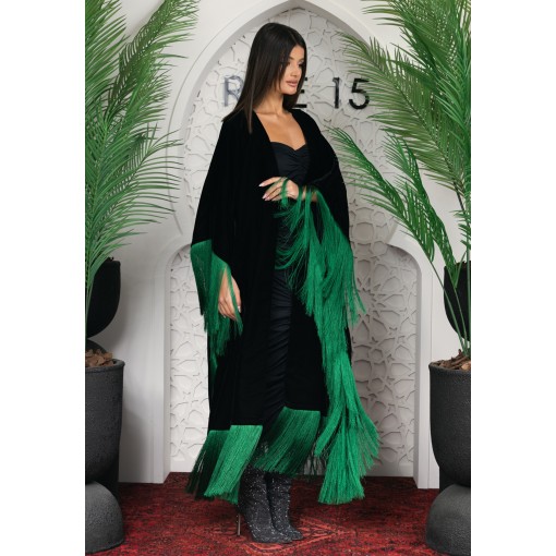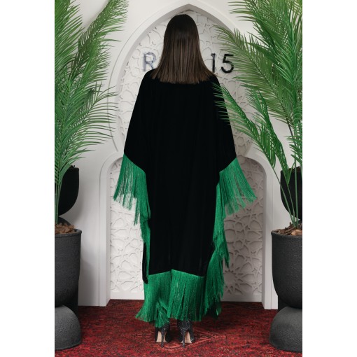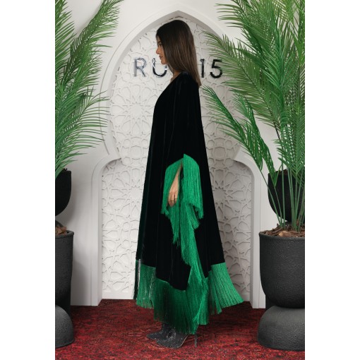 • Open-front bisht that is embellished with green fringes all around.