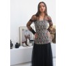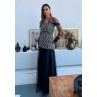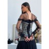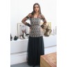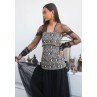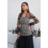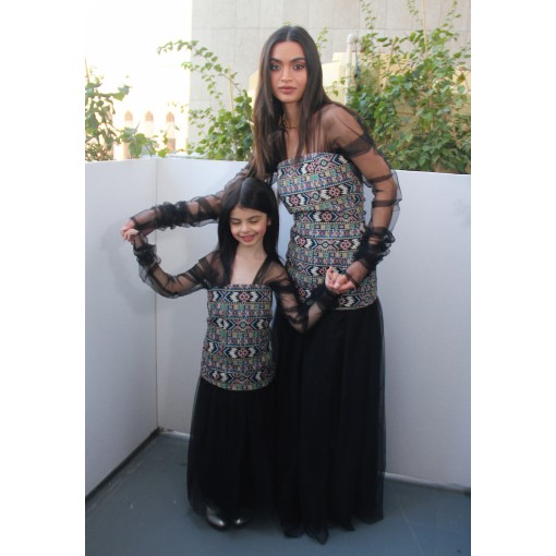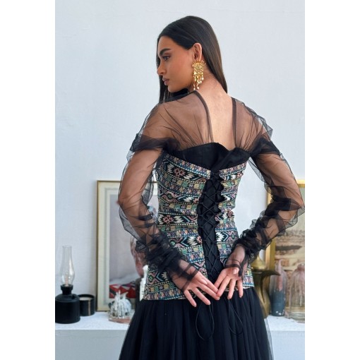 • "This Ramadan two-piece set exudes sophistication and cultural significance, making it a standout choice for evening gatherings and Ramadan events. The underdress is crafted from delicate tulle, a sheer and lightweight fabric that adds a touch of softness and elegance to the look. Overlaying the tulle dress is a structured corset made from tapestry fabric, featuring a striking Sadu print. This traditional pattern pays homage to Arabic and Khaliji culture, celebrating its rich heritage while adding a contemporary edge to the design. The corset is expertly tailored, with inner padding in the bra area to provide a flattering lift and beautifully sculpt the silhouette.Its timeless black, this ensemble combines tradition and modernity, offering a rich, elegant look that’s perfect for Ramadan evenings and special events.Model wears size Small.