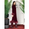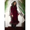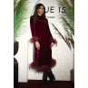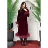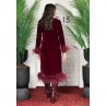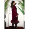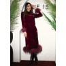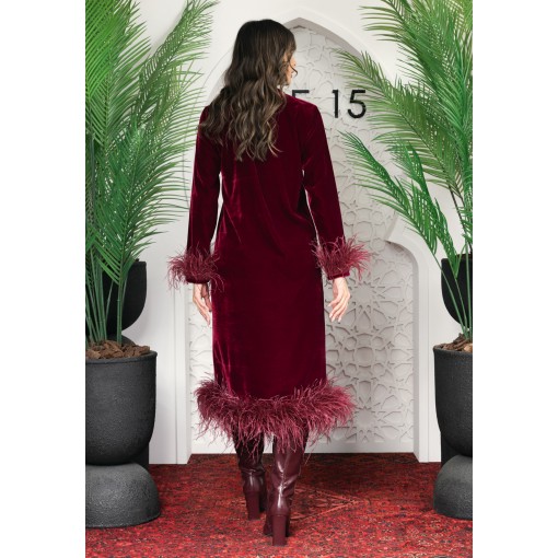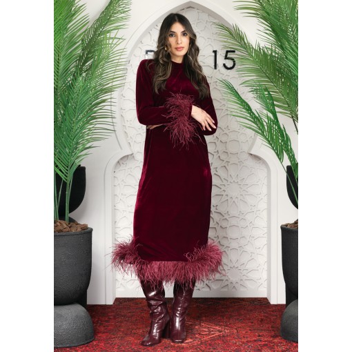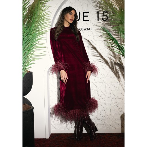 • Burgundy dress with burgundy feathered cuffs and hem.