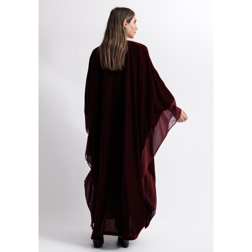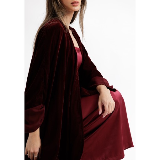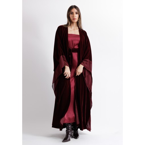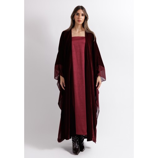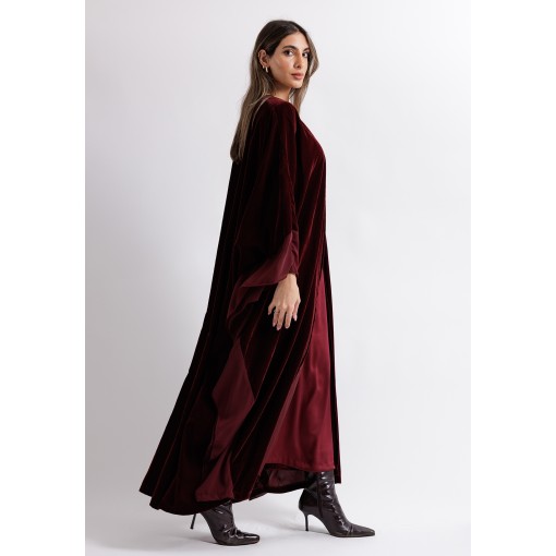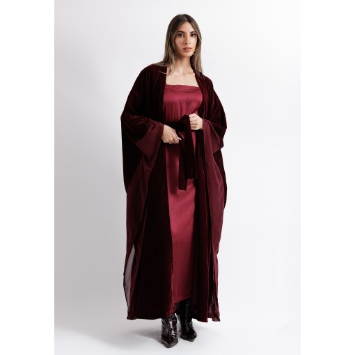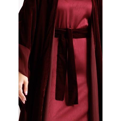 Crimson Red Velvet Belted Bisht With Satin Dress Set