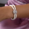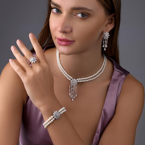 • The Fleur de Pearl Glow jewelry set combines the beauty of delicate pearls with intricate floral motifs and sparkling CZ stone tassels. The soft, feminine design evokes the image of a blossoming flower or a starry sky, while the radiant stones add a sophisticated shine. This luxurious combination of pearls and CZ stones makes it perfect for formal occasions and special celebrations. With flowing lines, symmetrical balance, and graceful charm, this set elevates your ensemble with an ethereal and refined glow.