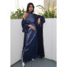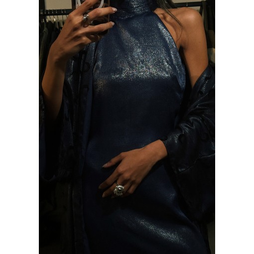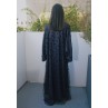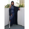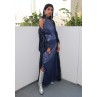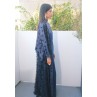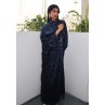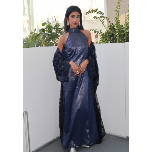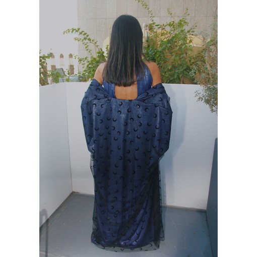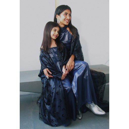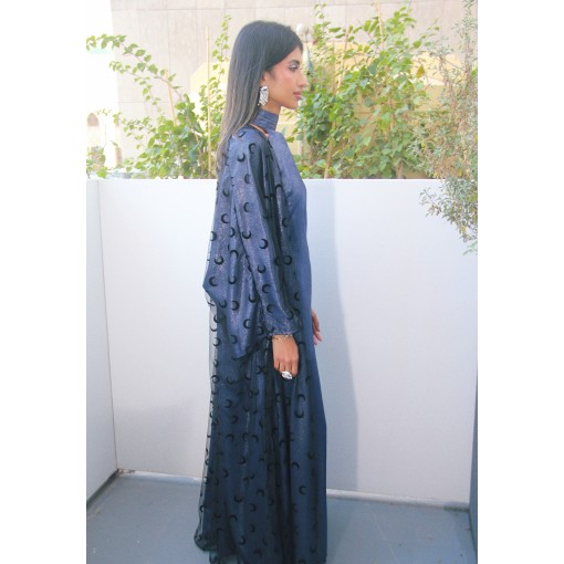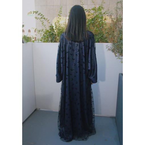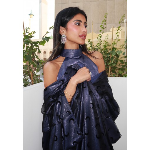 • "The “Hilal” two-piece Ramadan outfit beautifully embodies the spirit of Ramadan and Eid with its thoughtful design and luxurious materials. The inner dress is crafted from a stunning navy silky fabric with a shimmering finish, evoking elegance and sophistication, perfect for evening Ramadan gatherings.The outer bisht is a flowy overlay adorned with intricate crescent patterns, a symbolic nod to the crescent moon that signifies Ramadan. The combination of the shimmering dress and the celestial inspired bisht is ideal for celebrating meaningful moments during the holy month. Additional info: