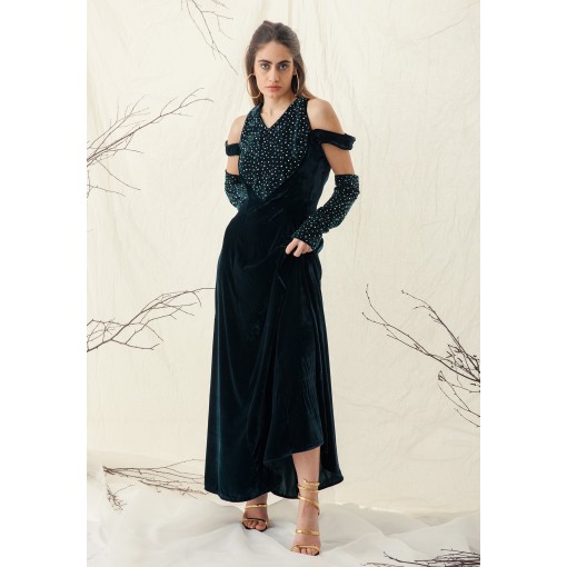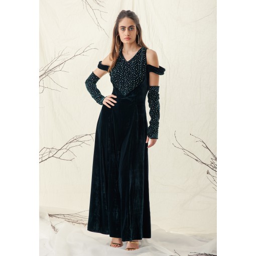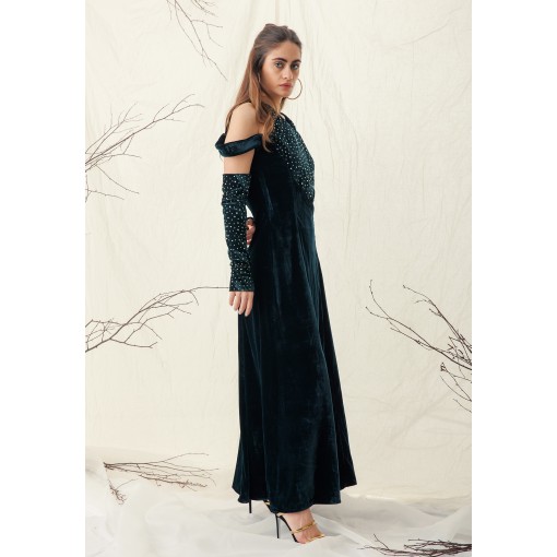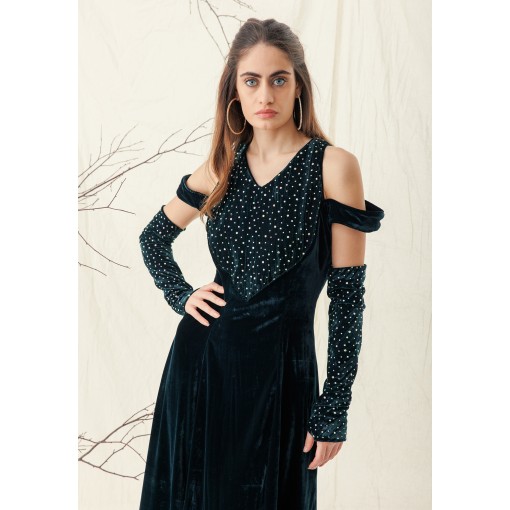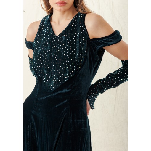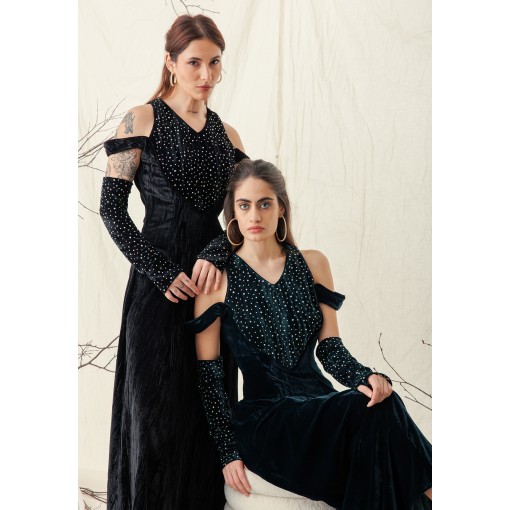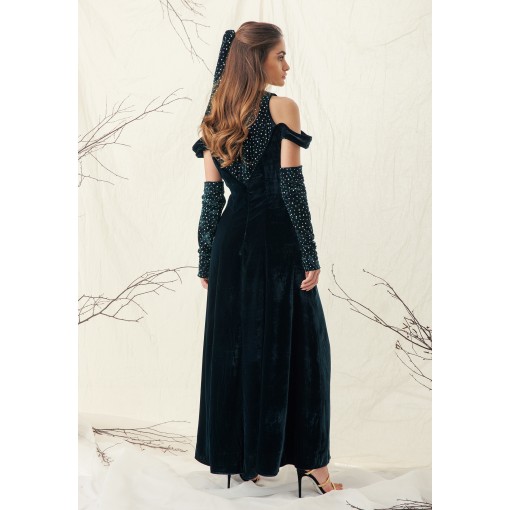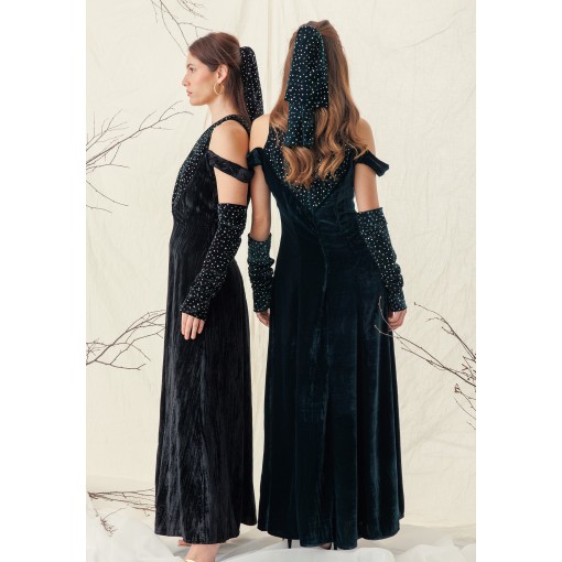 • Sleeveless gown with wide straps and asymmetrical shoulder bands, paired with fingerless elbow-length gloves