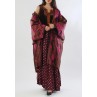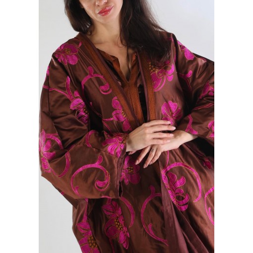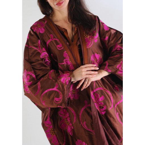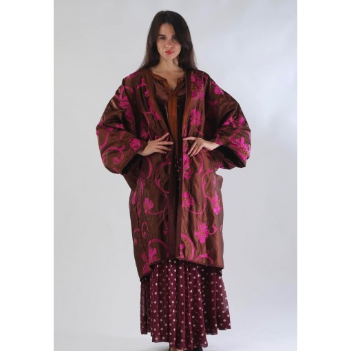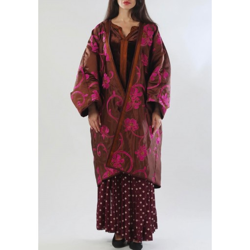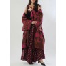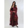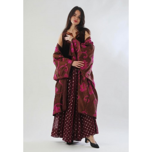 Embroidered Bisht with Ruffled Printed Velvet Dress – Brown & Fuchsia
