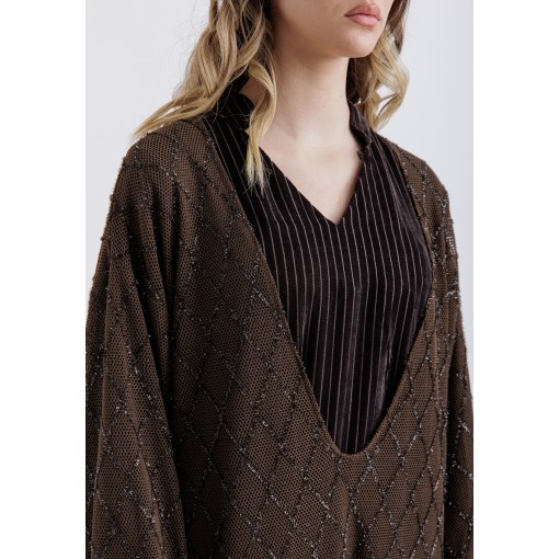 • An OUTER LAYER with diamond-pattern texture with subtle sheen and deep V-neckline.