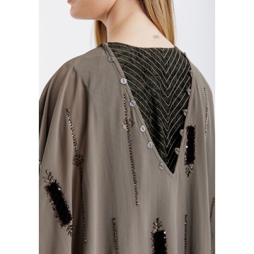 • Embroidered with shiny crystals and velvet rectangles.