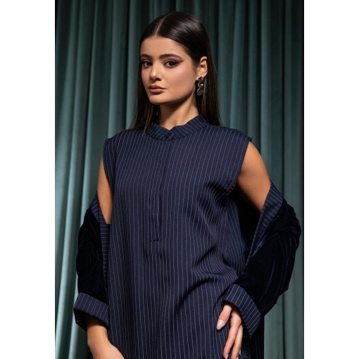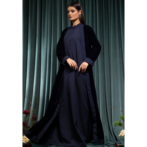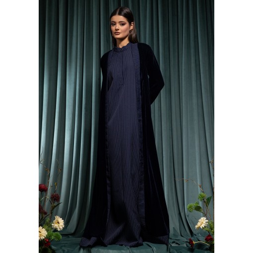 Navy Velvet Bisht With Striped Kaftan