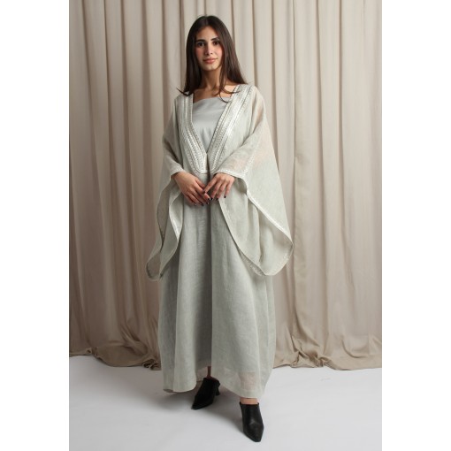 • set of luxury satin dress and an outer linen piece with silver embroidery.
