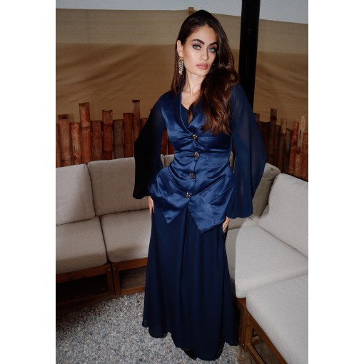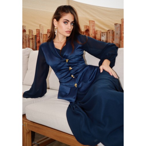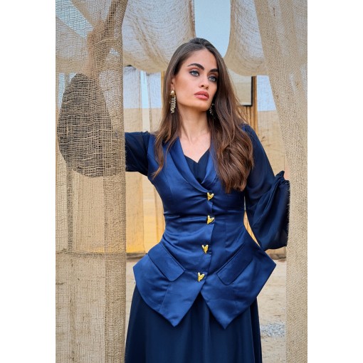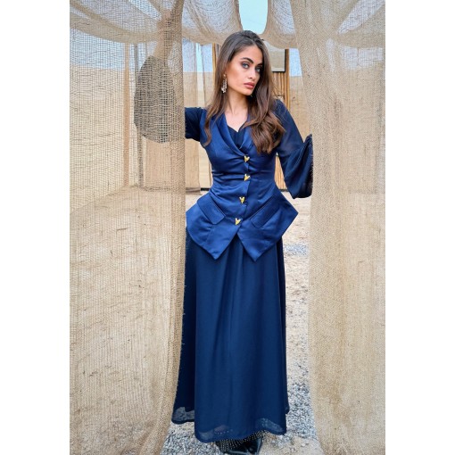 • It is paired with a a dress with V-neckline and flowy A-line cut.