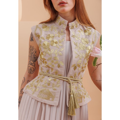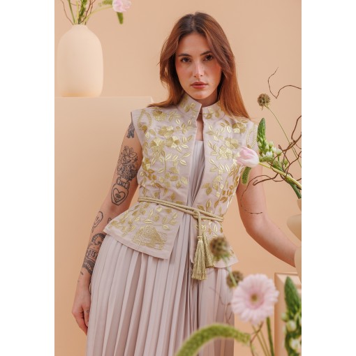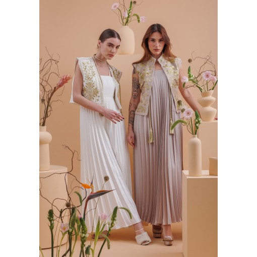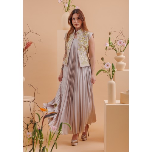 • The pleated fabric gown dress is taupe with a full embroidered vest with gold stitches and a matching belt.