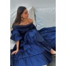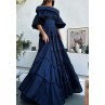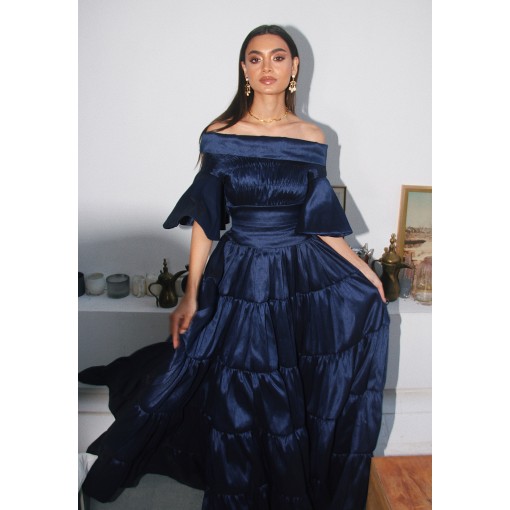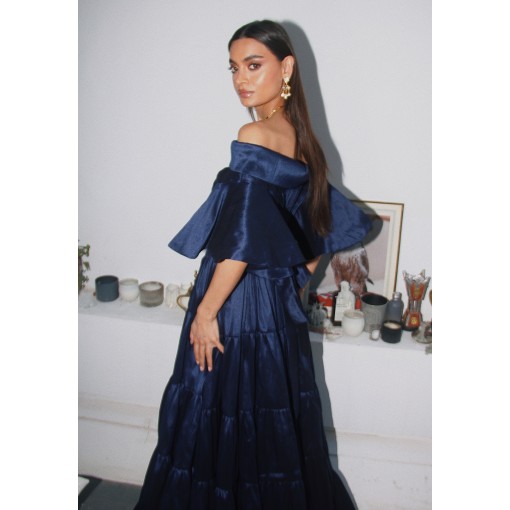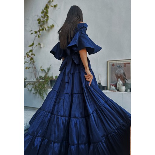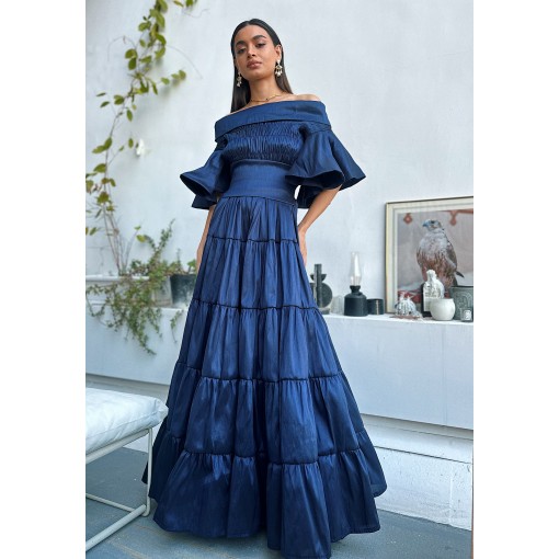 • Flowy A-line silhouette with tiered maxi skirt with multiple gathered layers.
