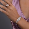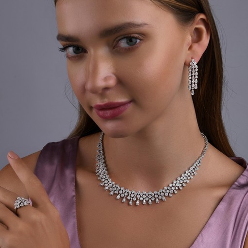 • This exquisite jewelry set features a necklace, earrings, bracelet, and ring, each designed with intricate floral motifs and sparkling stones. The necklace’s gracefully arranged petals create a soft, flowing effect, while the earrings and bracelet feature dangling elements that catch the light with every movement. The ring, with its delicate floral-inspired design, adds the perfect finishing touch. The combination of celestial curves and elegant floral accents makes the Lyra Fleur Set a true embodiment of refined beauty and sophisticated craftsmanship.