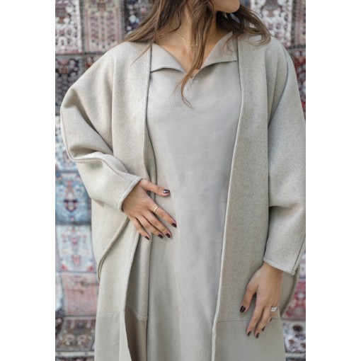 • Open-front bisht with long flared sleeves.