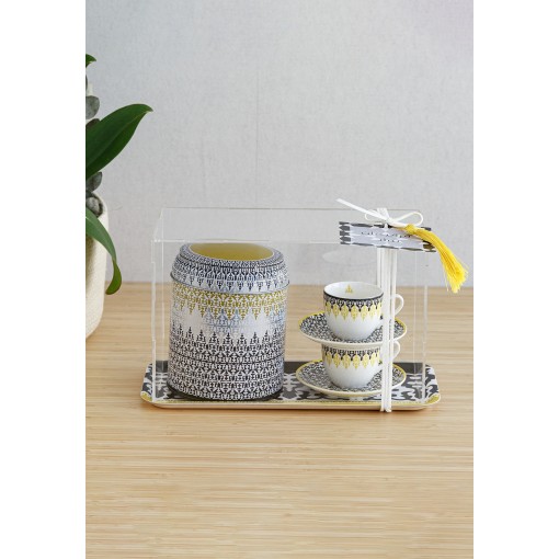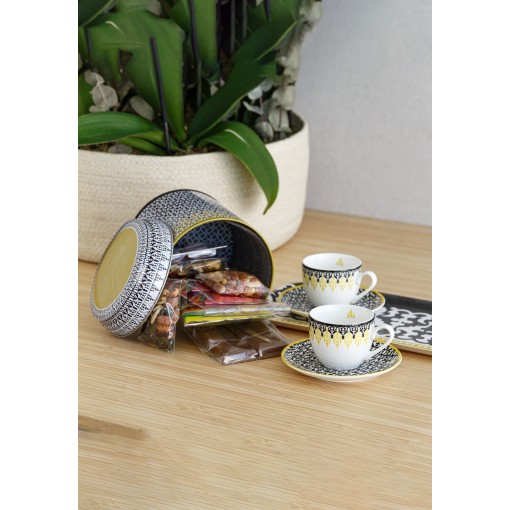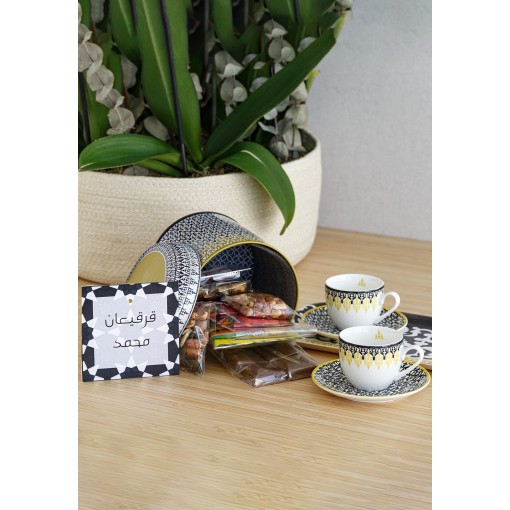 • A delightful Gergean gift featuring a Tin Box with 2 Cups & Saucers, filled with a rich chocolate mix—all beautifully packed in a transparent acrylic box for a festive touch.